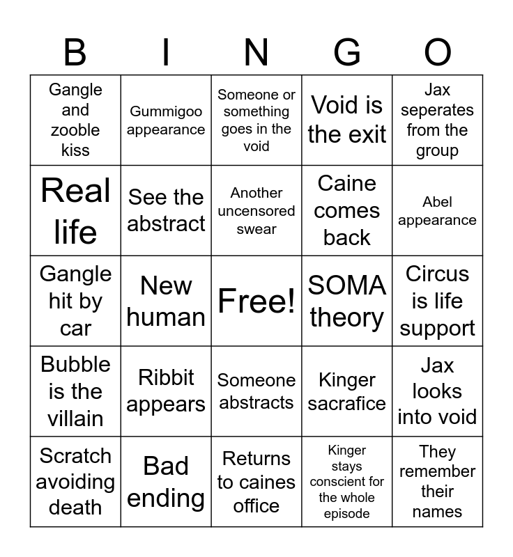 This bingo card has a free space and 24 words: Ribbit appears, Bad ending, Another uncensored swear, Scratch avoiding death, Jax seperates from the group, Gangle and zooble kiss, Real life, Gummigoo appearance, SOMA theory, Someone abstracts, Caine comes back, Gangle hit by car, Kinger sacrafice, Jax looks into void, See the abstract, Kinger stays conscient for the whole episode, Circus is life support, Someone or something goes in the void, Abel appearance, New human, They remember their names, Bubble is the villain, Void is the exit and Returns to caines office.