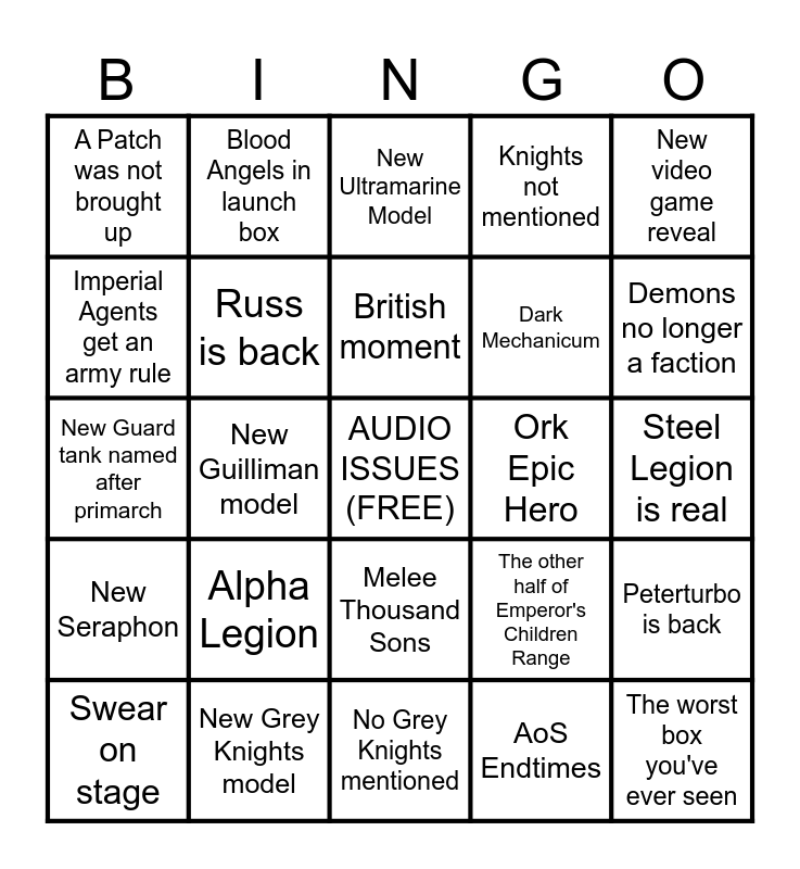 This bingo card has a free space and 24 words: Alpha Legion, New Grey Knights model, British moment, Swear on stage, New video game reveal, A Patch was not brought up, Imperial Agents get an army rule, Blood Angels in launch box, Ork Epic Hero, Melee Thousand Sons, Dark Mechanicum, New Guard tank named after primarch, The other half of Emperor's Children Range, Peterturbo is back, Russ is back, AoS Endtimes, Steel Legion is real, New Ultramarine Model, Demons no longer a faction, New Guilliman model, The worst box you've ever seen, New Seraphon, Knights not mentioned and No Grey Knights mentioned.