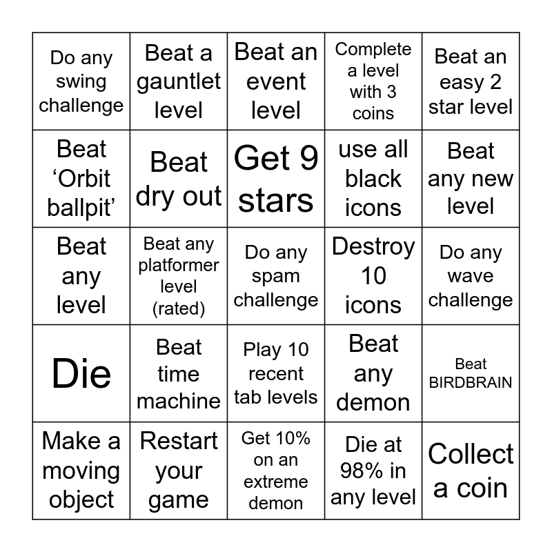 This bingo card has 25 words: Beat time machine, Get 10% on an extreme demon, Get 9 stars, Make a moving object, Beat an easy 2 star level, Do any swing challenge, Beat ‘Orbit ballpit’, Beat a gauntlet level, Destroy 10 icons, Play 10 recent tab levels, use all black icons, Beat any level, Beat any demon, Beat BIRDBRAIN, Beat dry out, Collect a coin, Do any wave challenge, Beat an event level, Beat any new level, Beat any platformer level (rated), Do any spam challenge, Restart your game, Die, Complete a level with 3 coins and Die at 98% in any level.