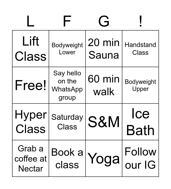 This bingo card has 16 words: Book a class, Ice Bath, 20 min Sauna, Lift Class, Hyper Class, Bodyweight Lower, S&M, Yoga, Free!, Say hello on the WhatsApp group, Grab a coffee at Nectar, Handstand Class, Saturday Class, Bodyweight Upper, 60 min walk and Follow our IG.