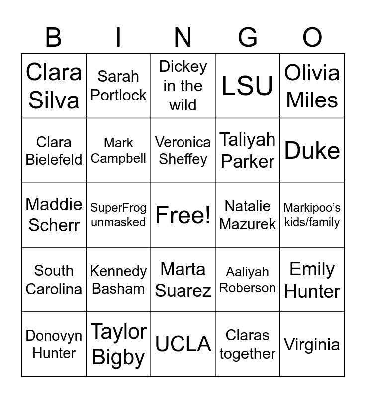 This bingo card has a free space and 24 words: Kennedy Basham, Taylor Bigby, Veronica Sheffey, Donovyn Hunter, Olivia Miles, Clara Silva, Clara Bielefeld, Sarah Portlock, Natalie Mazurek, Marta Suarez, Taliyah Parker, Maddie Scherr, Aaliyah Roberson, Emily Hunter, Mark Campbell, Claras together, Markipoo’s kids/family, Dickey in the wild, Duke, SuperFrog unmasked, Virginia, South Carolina, LSU and UCLA.