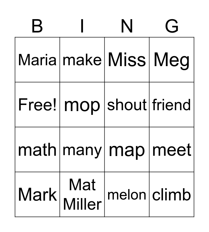 This bingo card has 16 words: Mat Miller, meet, Miss, Maria, math, make, map, melon, Free!, mop, Mark, Meg, many, friend, shout and climb.