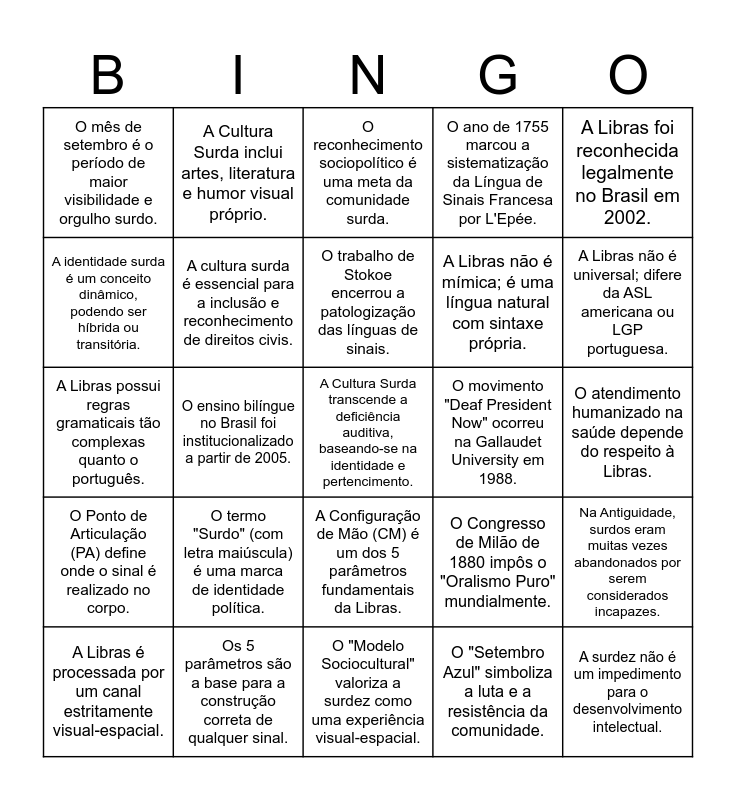 This bingo card has 46 words: Free!, A Cultura Surda transcende a deficiência auditiva, baseando-se na identidade e pertencimento., O "Modelo Médico" enxerga a surdez como uma patologia a ser corrigida., O "Modelo Sociocultural" valoriza a surdez como uma experiência visual-espacial., O termo "Surdo" (com letra maiúscula) é uma marca de identidade política., "Deficiente auditivo" é um termo associado ao modelo médico de normalização., A Cultura Surda inclui artes, literatura e humor visual próprio., A Comunidade Surda é uma rede que inclui surdos, familiares e intérpretes., A identidade surda é um conceito dinâmico, podendo ser híbrida ou transitória., O pertencimento à comunidade surda depende do nível de interação social., A cultura surda é essencial para a inclusão e reconhecimento de direitos civis., O ano de 1755 marcou a sistematização da Língua de Sinais Francesa por L'Epée., Na Antiguidade, surdos eram muitas vezes abandonados por serem considerados incapazes., O Congresso de Milão de 1880 impôs o "Oralismo Puro" mundialmente., O Congresso de Milão excluiu professores surdos das salas de aula., William Stokoe provou, em 1960, que a Libras possui gramática própria., O trabalho de Stokoe encerrou a patologização das línguas de sinais., O movimento "Deaf President Now" ocorreu na Gallaudet University em 1988., O "Deaf President Now" é um marco global de empoderamento surdo., A Libras foi reconhecida legalmente no Brasil em 2002., O ensino bilíngue no Brasil foi institucionalizado a partir de 2005., O "Setembro Azul" simboliza a luta e a resistência da comunidade., O mês de setembro é o período de maior visibilidade e orgulho surdo., A Libras não é mímica; é uma língua natural com sintaxe própria., A Libras não é português sinalizado; possui léxico original., A Libras não é universal; difere da ASL americana ou LGP portuguesa., A Libras é processada por um canal estritamente visual-espacial., A Libras não é baseada em sons ou fonemas., A Configuração de Mão (CM) é um dos 5 parâmetros fundamentais da Libras., O Ponto de Articulação (PA) define onde o sinal é realizado no corpo., O Movimento (M) é essencial para a dinâmica e sentido do sinal., A Orientação da palma da mão altera o significado do sinal., A Expressão Facial e Corporal é a "gramática invisível" da Libras., A expressão facial substitui a entonação da voz no português., A ordem das frases na Libras pode variar entre SOV, SVO ou VSO., Os 5 parâmetros são a base para a construção correta de qualquer sinal., O atendimento humanizado na saúde depende do respeito à Libras., A garantia dos direitos civis passa pela fluência na língua de sinais., O papel do intérprete é crucial para a mediação comunicativa., A resistência é um pilar central na construção da identidade surda., A surdez não é um impedimento para o desenvolvimento intelectual., O reconhecimento sociopolítico é uma meta da comunidade surda., A Libras possui regras gramaticais tão complexas quanto o português., A visibilidade da Libras ajuda a combater o preconceito linguístico., A educação bilíngue é um direito fundamental do aluno surdo. and Valorizar a Libras é valorizar a diversidade humana e cultural..