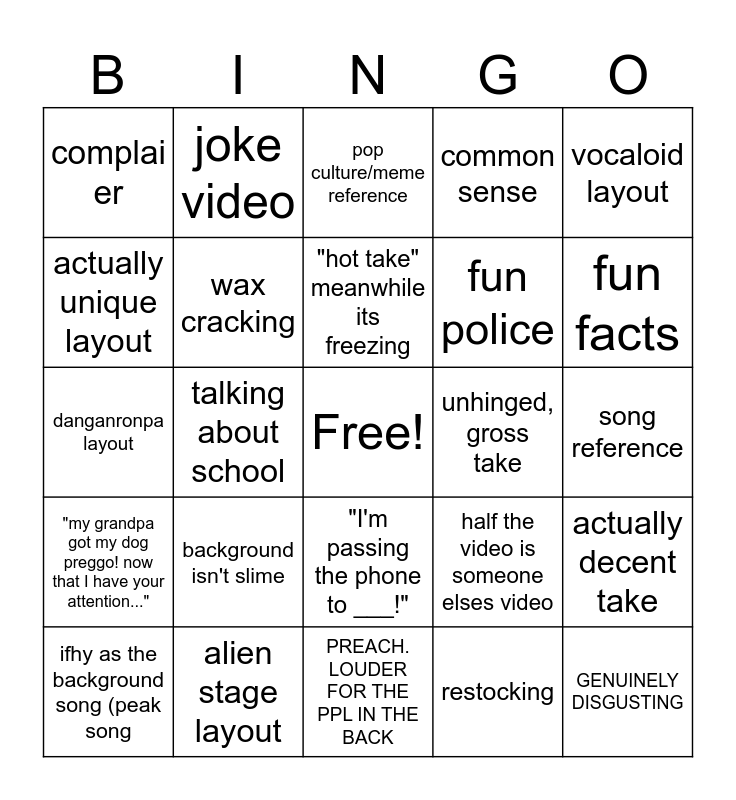 This bingo card has a free space and 24 words: background isn't slime, alien stage layout, "hot take" meanwhile its freezing, ifhy as the background song (peak song, vocaloid layout, complai er, actually unique layout, joke video, unhinged, gross take, "I'm passing the phone to ___!", fun police, danganronpa layout, half the video is someone elses video, actually decent take, wax cracking, restocking, song reference, pop culture/meme reference, fun facts, talking about school, GENUINELY DISGUSTING, "my grandpa got my dog preggo! now that I have your attention...", common sense and PREACH. LOUDER FOR THE PPL IN THE BACK.