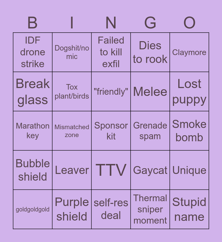 This bingo card has a free space and 24 words: Leaver, Purple shield, "friendly", goldgoldgold, Claymore, IDF drone strike, Break glass, Dogshit/no mic, Grenade spam, TTV, Melee, Marathon key, Gaycat, Unique, Tox plant/birds, Thermal sniper moment, Smoke bomb, Failed to kill exfil, Lost puppy, Mismatched zone, Stupid name, Bubble shield, Dies to rook and self-res deal.