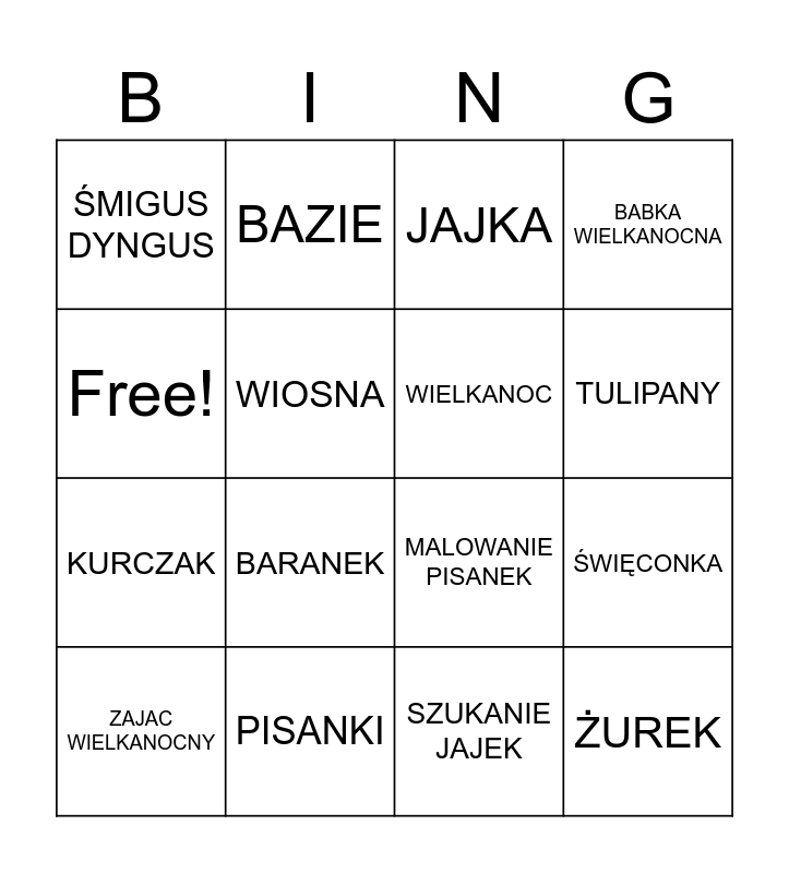 This bingo card has 16 words: PISANKI, ŚWIĘCONKA, JAJKA, ŚMIGUS DYNGUS, KURCZAK, BAZIE, MALOWANIE PISANEK, SZUKANIE JAJEK, Free!, WIOSNA, ZAJAC WIELKANOCNY, BABKA WIELKANOCNA, BARANEK, TULIPANY, WIELKANOC and ŻUREK.