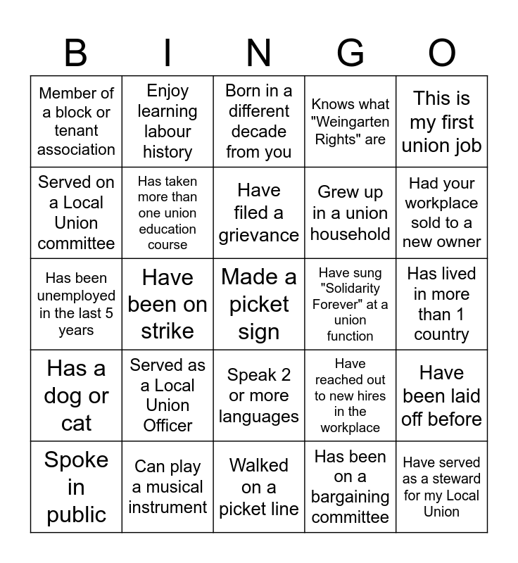 This bingo card has 25 words: Served as a Local Union Officer, Walked on a picket line, Have filed a grievance, Spoke in public, This is my first union job, Member of a block or tenant association, Served on a Local Union committee, Enjoy learning labour history, Have sung "Solidarity Forever" at a union function, Speak 2 or more languages, Grew up in a union household, Has been unemployed in the last 5 years, Have reached out to new hires in the workplace, Have been laid off before, Has taken more than one union education course, Have served as a steward for my Local Union, Has lived in more than 1 country, Born in a different decade from you, Had your workplace sold to a new owner, Have been on strike, Made a picket sign, Can play a musical instrument, Has a dog or cat, Knows what "Weingarten Rights" are and Has been on a bargaining committee.