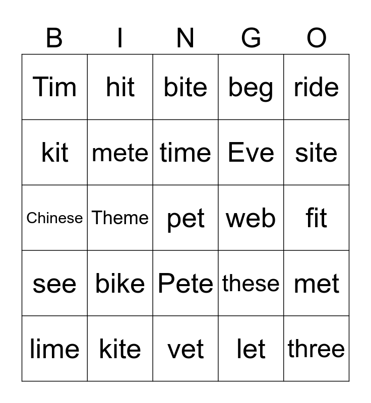 This bingo card has a free space and 24 words: bike, kite, time, lime, ride, Tim, kit, hit, web, Pete, Eve, Chinese, these, met, mete, let, fit, bite, site, Theme, three, see, beg and vet.