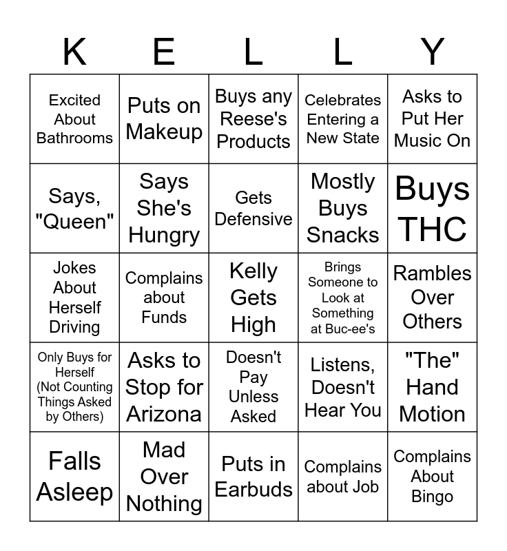 This bingo card has a free space and 24 words: Asks to Stop for Arizona, Mad Over Nothing, Gets Defensive, Falls Asleep, Asks to Put Her Music On, Excited About Bathrooms, Says, "Queen", Puts on Makeup, Brings Someone to Look at Something at Buc-ee's, Doesn't Pay Unless Asked, Mostly Buys Snacks, Jokes About Herself Driving, Listens, Doesn't Hear You, "The" Hand Motion, Says She's Hungry, Complains about Job, Rambles Over Others, Buys any Reese's Products, Buys THC, Complains about Funds, Complains About Bingo, Only Buys for Herself (Not Counting Things Asked by Others), Celebrates Entering a New State and Puts in Earbuds.
