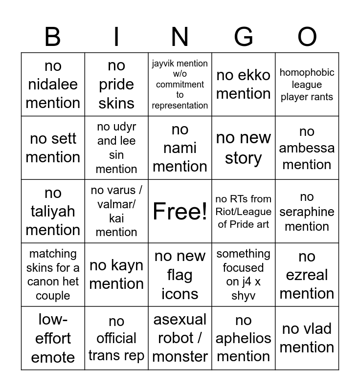 This bingo card has a free space and 24 words: no kayn mention, no official trans rep, no nami mention, low-effort emote, homophobic league player rants, no nidalee mention, no sett mention, no pride skins, no RTs from Riot/League of Pride art, no new flag icons, no new story, no taliyah mention, something focused on j4 x shyv, no ezreal mention, no udyr and lee sin mention, no aphelios mention, no seraphine mention, jayvik mention w/o commitment to representation, no ambessa mention, no varus / valmar/ kai mention, no vlad mention, matching skins for a canon het couple, no ekko mention and asexual robot / monster.