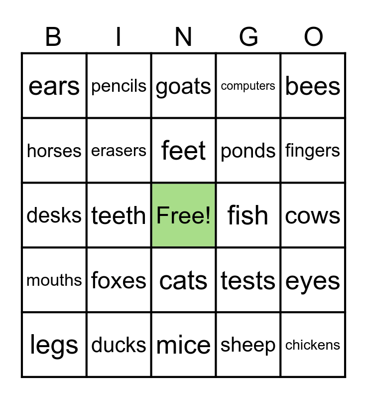 This bingo card has a free space and 24 words: foxes, ducks, feet, legs, bees, ears, horses, pencils, fish, cats, ponds, desks, tests, eyes, erasers, sheep, cows, goats, fingers, teeth, chickens, mouths, computers and mice.