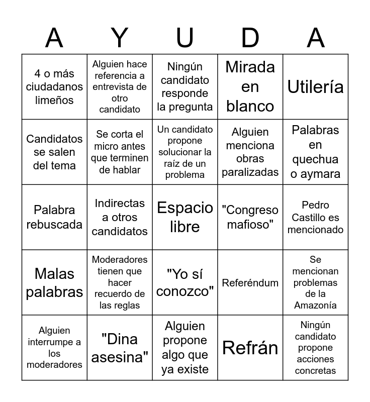 This bingo card has a free space and 29 words: Alguien interrumpe a los moderadores, Los moderadores se interrumpen entre ellos, Indirectas a otros candidatos, Moderadores tienen que pedir que contesten la pregunta, 4 o más ciudadanos limeños, Ningún candidato responde la pregunta, Se corta el micro antes que terminen de hablar, Moderadores tienen que hacer recuerdo de las reglas, "Congreso mafioso", "Dina asesina", Pedro Castillo es mencionado, Ningún candidato propone acciones concretas, Alguien propone algo que ya existe, Refrán, Palabras en quechua o aymara, Candidato le habla a los jóvenes, "Yo sí conozco", Malas palabras, Utilería, Palabra rebuscada, Referéndum, Candidato usa su mensaje final para hablar de otro candidato, Alguien menciona obras paralizadas, Candidatos se salen del tema, Mirada en blanco, Alguien hace referencia a entrevista de otro candidato, Se mencionan problemas de la Amazonía, Un candidato propone solucionar la raíz de un problema and Oraciones incoherentes.