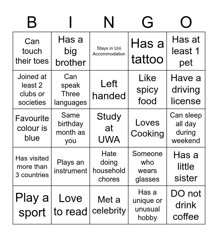 This bingo card has a free space and 24 words: Plays an instrument, Love to read, Left handed, Play a sport, Has at least 1 pet, Can touch their toes, Joined at least 2 clubs or societies, Has a big brother, Loves Cooking, Hate doing household chores, Like spicy food, Favourite colour is blue, Someone who wears glasses, Has a little sister, Can speak Three languages, Has a unique or unusual hobby, Can sleep all day during weekend, Stays in Uni Accommodation, Have a driving license, Same birthday month as you, DO not drink coffee, Has visited more than 3 countries, Has a tattoo and Met a celebrity.