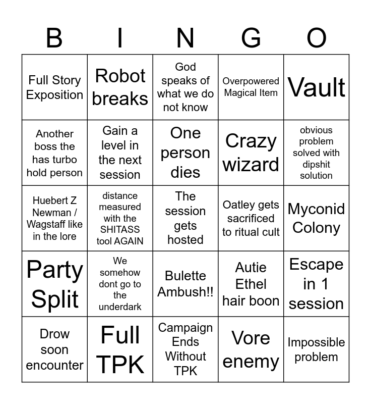 This bingo card has a free space and 24 words: We somehow dont go to the underdark, Full TPK, One person dies, Drow soon encounter, Vault, Full Story Exposition, Another boss the has turbo hold person, Robot breaks, Oatley gets sacrificed to ritual cult, Bulette Ambush!!, Crazy wizard, Huebert Z Newman / Wagstaff like in the lore, Autie Ethel hair boon, Escape in 1 session, Gain a level in the next session, Vore enemy, Myconid Colony, God speaks of what we do not know, obvious problem solved with dipshit solution, distance measured with the SHITASS tool AGAIN, Impossible problem, Party Split, Overpowered Magical Item and Campaign Ends Without TPK.