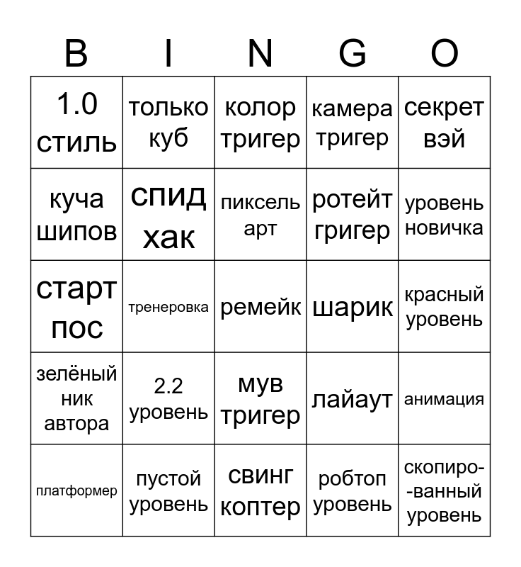 This bingo card has a free space and 24 words: 2.2 уровень, пустой уровень, пиксель арт, платформер, секрет вэй, 1.0 стиль, куча шипов, только куб, шарик, мув тригер, ротейт григер, старт пос, лайаут, анимация, спид хак, робтоп уровень, красный уровень, колор тригер, уровень новичка, тренеровка, скопиро- -ванный уровень, зелёный ник автора, камера тригер and свинг коптер.