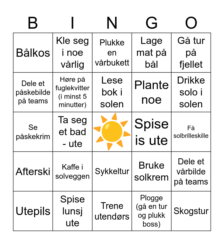 This bingo card has a free space and 29 words: Utepils, Skitur, Ta seg et bad - ute, Starte grillsesongen, Bålkos, Plukke en vårbukett, Høre på fuglekvitter (i minst 5 minutter), Kaffe i solveggen, Spise is ute, Spise lunsj ute, Få solbrilleskille, Skogstur, Trene utendørs, Plogge (gå en tur og plukk boss), Drikke solo i solen, Jogge, Sykkeltur, Afterski, Gå tur på fjellet, Se påskekrim, Bruke solkrem, Båttur, Plante noe, Dele et påskebilde på teams, Lage mat på bål, Kle seg i noe vårlig, Dele et vårbilde på teams, Lese bok i solen and Se et lam.