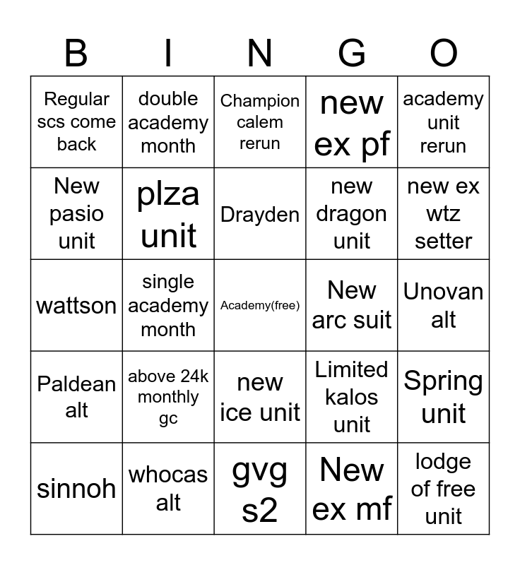 This bingo card has a free space and 24 words: above 24k monthly gc, whocas alt, Drayden, sinnoh, academy unit rerun, Regular scs come back, New pasio unit, double academy month, New arc suit, new ice unit, new dragon unit, wattson, Limited kalos unit, Spring unit, plza unit, New ex mf, Unovan alt, Champion calem rerun, new ex wtz setter, single academy month, lodge of free unit, Paldean alt, new ex pf and gvg s2.