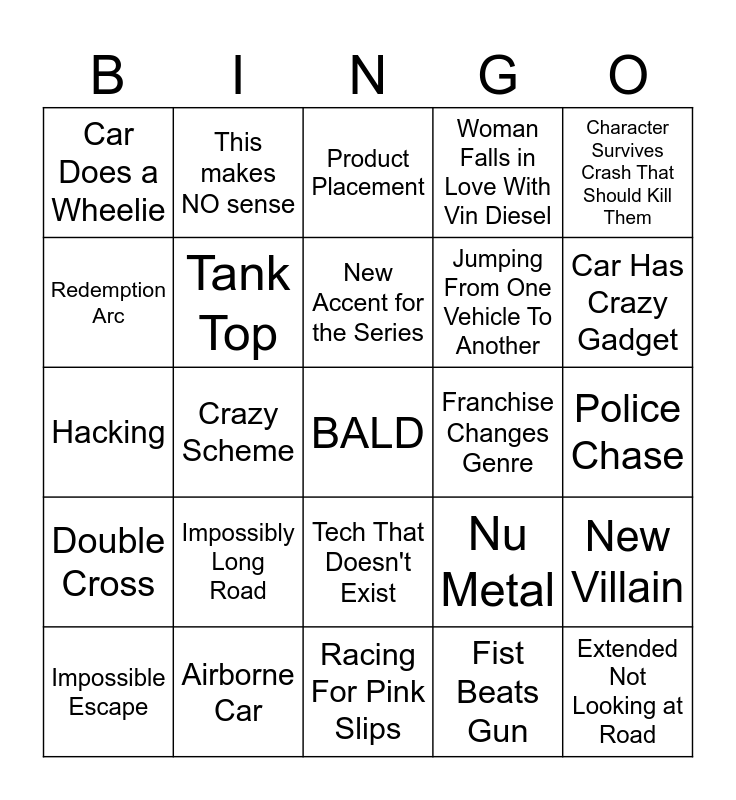 This bingo card has a free space and 58 words: Car Explodes, Airborne Car, Family Mentioned, Double Cross, Fist Beats Gun, Car Used as Weapon, Tank Top, Frosted Tips, Jumping From One Vehicle To Another, Bullying, Woman Falls in Love With Vin Diesel, Sandwiches, How Many Gears was That???, Military Vehicle Defeated by Car, Close up on gear shift/pedals, Car Does a Wheelie, Extended Not Looking at Road, Character Survives Crash That Should Kill Them, Character Dies, New Accent for the Series, Franchise Changes Genre, Product Placement, Impossible Escape, New Villain, New Celebrity Appears, Police Chase, Street Racing, Car Modification Montage, Car Has Crazy Gadget, Shot of Woman Leaning on Car, NOS, Drives so Hard the Car Breaks, Weird Religious Moments, Engine on Fire, Character Returns to the Series, Back From The Dead, One Last Job, Crazy Scheme, Hacking, Car Underglow, Impossibly Long Road, Bechdel Test, Nu Metal, You Can't Say That Anymore, He's Got A Gun, Converse Shoes, Family Dinner, Tech That Doesn't Exist, Racing For Pink Slips, New Movie Retcons Old Movie, Dodge Charger on Screen, Nissan Skyline on Screen, Friends to Enemies, Enemies to Friends, This makes NO sense, New Country, Redemption Arc and Sick One Liner.