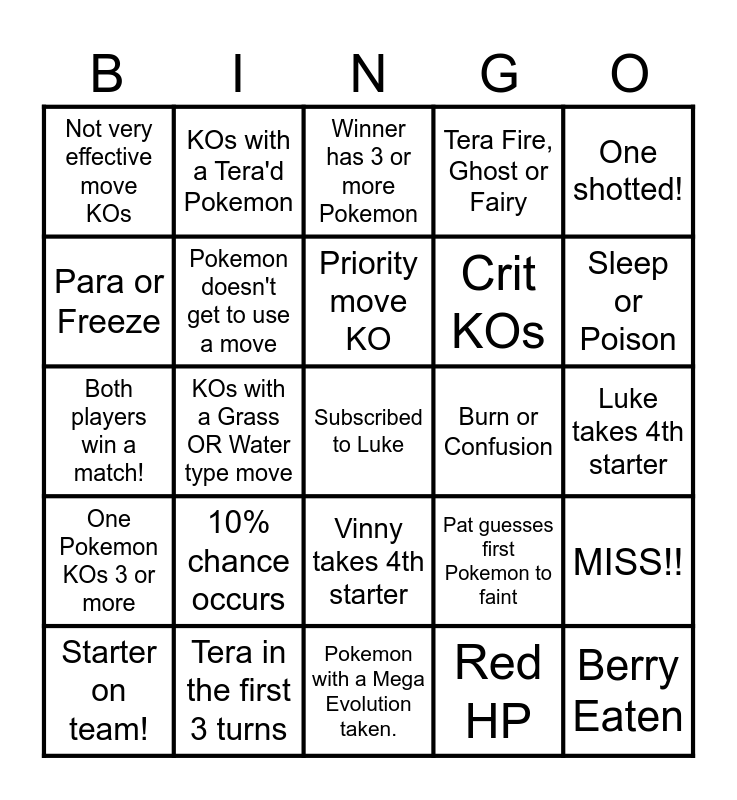 This bingo card has a free space and 24 words: 10% chance occurs, Tera in the first 3 turns, Priority move KO, Starter on team!, One shotted!, Not very effective move KOs, Para or Freeze, KOs with a Tera'd Pokemon, Burn or Confusion, Vinny takes 4th starter, Crit KOs, Both players win a match!, Pat guesses first Pokemon to faint, MISS!!, Pokemon doesn't get to use a move, Red HP, Luke takes 4th starter, Winner has 3 or more Pokemon, Sleep or Poison, KOs with a Grass OR Water type move, Berry Eaten, One Pokemon KOs 3 or more, Tera Fire, Ghost or Fairy and Pokemon with a Mega Evolution taken..