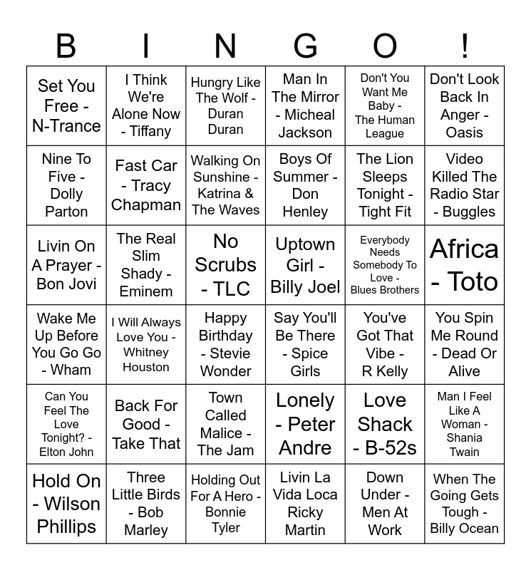 This bingo card has 36 words: Lonely - Peter Andre, Town Called Malice -The Jam, Livin La Vida Loca Ricky Martin, Nine To Five - Dolly Parton, Wake Me Up Before You Go Go - Wham, Uptown Girl - Billy Joel, Fast Car - Tracy Chapman, Holding Out For A Hero - Bonnie Tyler, Don't You Want Me Baby - The Human League, Love Shack - B-52s, Video Killed The Radio Star - Buggles, Man In The Mirror - Micheal Jackson, Man I Feel Like A Woman - Shania Twain, The Real Slim Shady - Eminem, Boys Of Summer - Don Henley, Set You Free - N-Trance, Can You Feel The Love Tonight? - Elton John, Everybody Needs Somebody To Love - Blues Brothers, Livin On A Prayer - Bon Jovi, Hungry Like The Wolf - Duran Duran, No Scrubs - TLC, I Will Always Love You - Whitney Houston, Say You'll Be There - Spice Girls, Happy Birthday - Stevie Wonder, You've Got That Vibe - R Kelly, I Think We're Alone Now - Tiffany, The Lion Sleeps Tonight - Tight Fit, Three Little Birds - Bob Marley, Walking On Sunshine - Katrina & The Waves, Don't Look Back In Anger - Oasis, When The Going Gets Tough - Billy Ocean, Hold On - Wilson Phillips, You Spin Me Round - Dead Or Alive, Africa - Toto, Back For Good - Take That and Down Under - Men At Work.