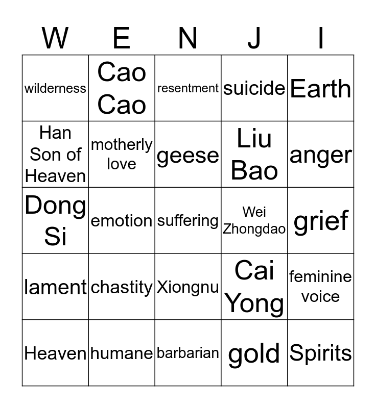 This bingo card has 25 words: chastity, barbarian, geese, Heaven, Earth, wilderness, Han Son of Heaven, Cao Cao, Wei Zhongdao, Xiongnu, Liu Bao, Dong Si, Cai Yong, feminine voice, motherly love, Spirits, grief, resentment, anger, emotion, suffering, humane, lament, suicide and gold.