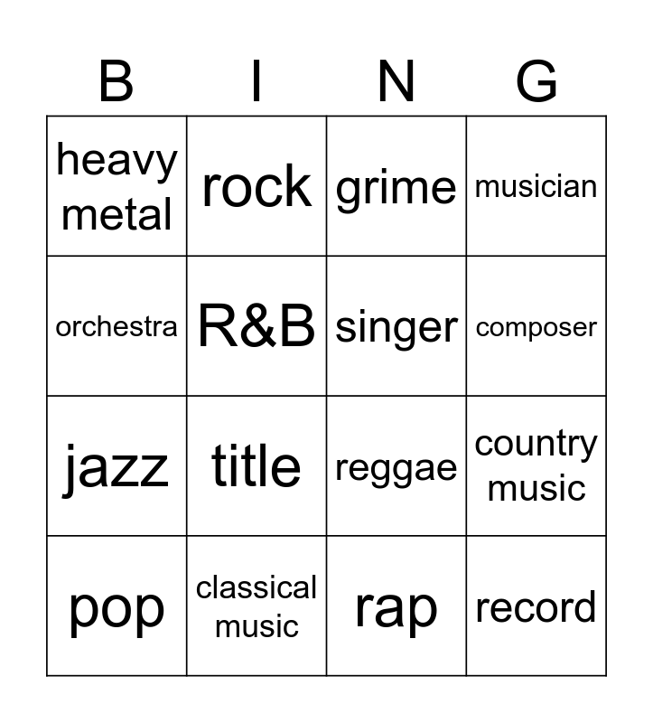 This bingo card has 16 words: classical music, country music, grime, heavy metal, jazz, rock, reggae, rap, orchestra, R&B, pop, musician, title, composer, singer and record.
