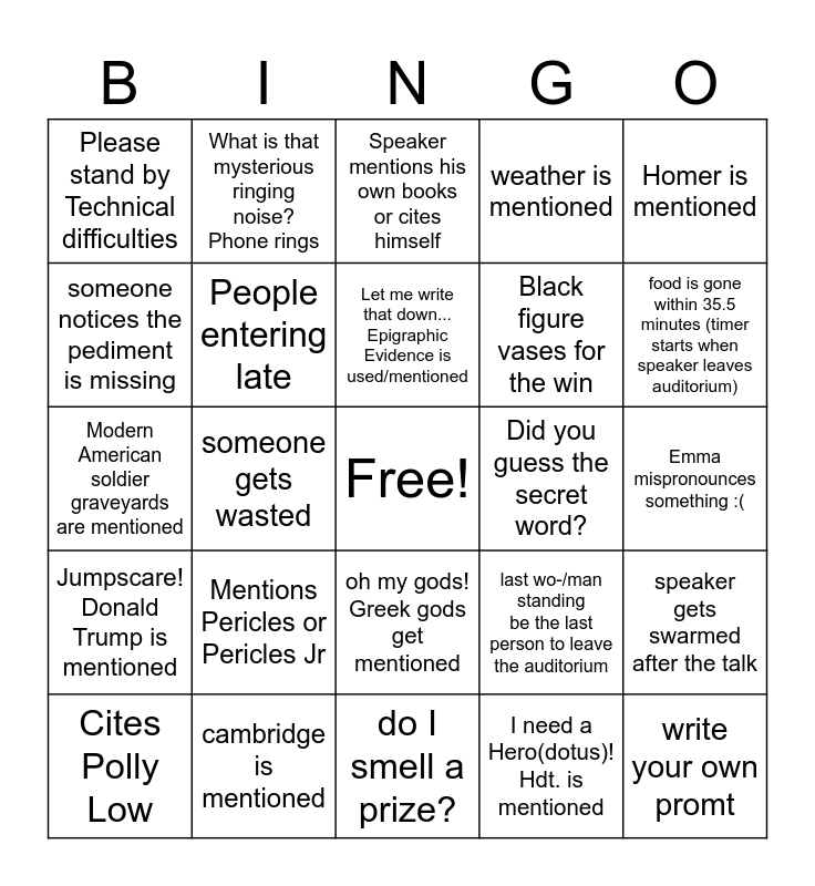 This bingo card has a free space and 24 words: Cites Polly Low, Mentions Pericles or Pericles Jr, Let me write that down... Epigraphic Evidence is used/mentioned, I need a Hero(dotus)! Hdt. is mentioned, Homer is mentioned, Please stand by Technical difficulties, What is that mysterious ringing noise? Phone rings, Speaker mentions his own books or cites himself, Did you guess the secret word?, Emma mispronounces something :(, Modern American soldier graveyards are mentioned, People entering late, last wo-/man standing be the last person to leave the auditorium, speaker gets swarmed after the talk, someone notices the pediment is missing, cambridge is mentioned, do I smell a prize?, weather is mentioned, food is gone within 35.5 minutes (timer starts when speaker leaves auditorium), Jumpscare! Donald Trump is mentioned, someone gets wasted, oh my gods! Greek gods get mentioned, Black figure vases for the win and write your own promt.