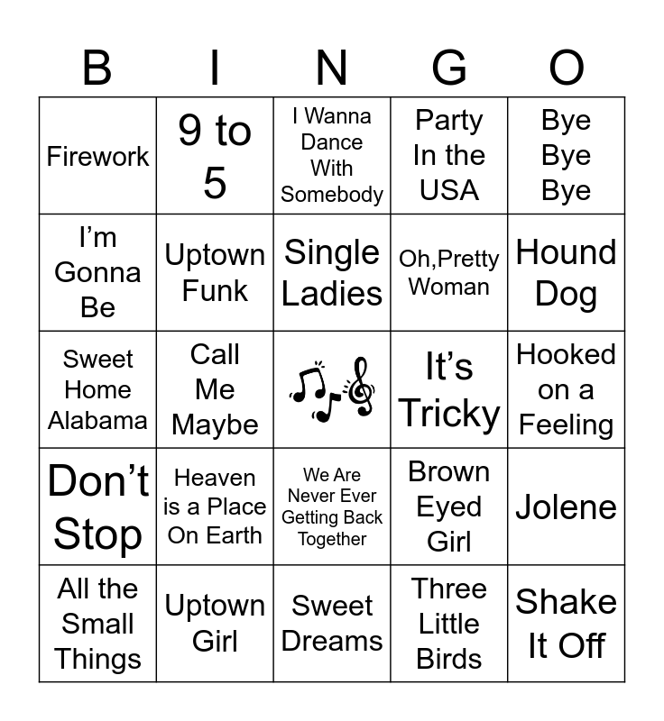 This bingo card has a free space and 77 words: Wannabe, Dancing Queen, I Wanna Dance With Somebody, You’re the One That I Want, All Star, Get the Party Started, Lady Marmalade, Mickey, Everybody, The Fresh Prince of BelAir, Oops! I Did It Again, Never Gonna Give You Up, Single Ladies, I’m Gonna Be, MMMBop, Call Me Maybe, That Don’t Impress Me Much, Shake It Off, Love Shack, Bye Bye Bye, Sweet Caroline, Sweet Home Alabama, Uptown Funk, 9 to 5, Party In the USA, Levitating, Barbie Girl, Girls Just Want to Have Fun, Who Let the Dogs Out, Walking on Sunshine, Ring of Fire, Respect, We Built This City, Brown Eyed Girl, Hound Dog, Oh,Pretty Woman, Señorita, We Will Rock You, Hooked on a Feeling, Three Little Birds, The Middle, I’m Yours, Hips Don’t Lie, Hit Me With Your Best Shot, I Love Rock ‘N Roll, Fight For Your Right, All the Small Things, Firework, I Gotta Feeling, Hey Soul Sister, Since U Been Gone, We Are Never Ever Getting Back Together, Let’s Get Loud, Rockin Robin, Twist and Shout, Hit the Road Jack, Ice Ice Baby, U Can’t Touch This, The Time of My Life, Take On Me, Heaven is a Place On Earth, I’ll Be There For You, Shut Up And Dance, Girl on Fire, Cotton Eye Joe, Dynamite, Best Day of My Life, It’s Tricky, Ain’t No Mountain High Enough, Thunder, Dirt On My Boots, Jolene, Don’t Stop, Uptown Girl, Don’t Stop Believin’, Sweet Dreams and You Give Love a Bad Name.