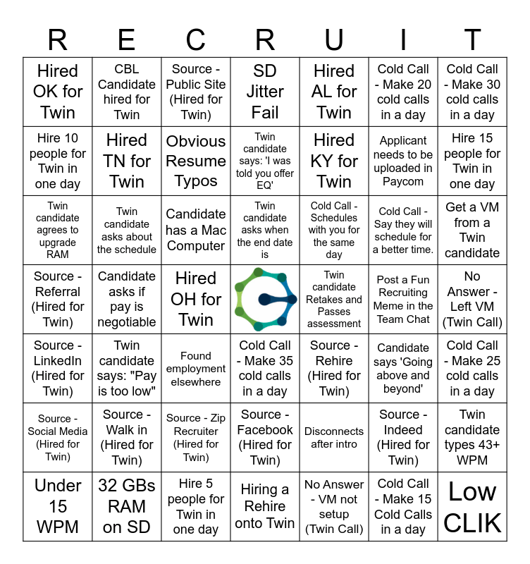 This bingo card has a free space and 52 words: 32 GBs RAM on SD, Applicant needs to be uploaded in Paycom, Blacklisted Candidate, Candidate asks if pay is negotiable, Candidate has a Mac Computer, Candidate says 'Going above and beyond', CBL Candidate hired for Twin, Cold Call - Make 15 Cold Calls in a day, Cold Call - Make 20 cold calls in a day, Cold Call - Make 25 cold calls in a day, Cold Call - Make 30 cold calls in a day, Cold Call - Make 35 cold calls in a day, Cold Call - Say they will schedule for a better time., Cold Call - Schedules with you for the same day, Disconnects after intro, Found employment elsewhere, Hire 10 people for Twin in one day, Hire 15 people for Twin in one day, Hire 5 people for Twin in one day, Hired AL for Twin, Hired KY for Twin, Hired OH for Twin, Hired OK for Twin, Hired TN for Twin, Hiring a Rehire onto Twin, Low CLIK, No Answer - Left VM (Twin Call), No Answer - VM not setup (Twin Call), Obvious Resume Typos, Post a Fun Recruiting Meme in the Team Chat, Rehire - Not Eligible, SD Jitter Fail, Source - Facebook (Hired for Twin), Source - Indeed (Hired for Twin), Source - LinkedIn (Hired for Twin), Source - Public Site (Hired for Twin), Source - Referral (Hired for Twin), Source - Rehire (Hired for Twin), Source - Social Media (Hired for Twin), Source - Walk in (Hired for Twin), Source - Zip Recruiter (Hired for Twin), Twin candidate agrees to upgrade RAM, Twin candidate asks about the schedule, Twin candidate asks if it's seasonal or temp, Twin candidate asks when the end date is, Twin candidate Retakes and Passes assessment, Twin candidate says: "Pay is too low", Twin candidate says: 'I was told you offer EQ', Twin candidate types 43+ WPM, Under 15 WPM, Get a VM from a Twin candidate and Candidate has TV noise in the background.