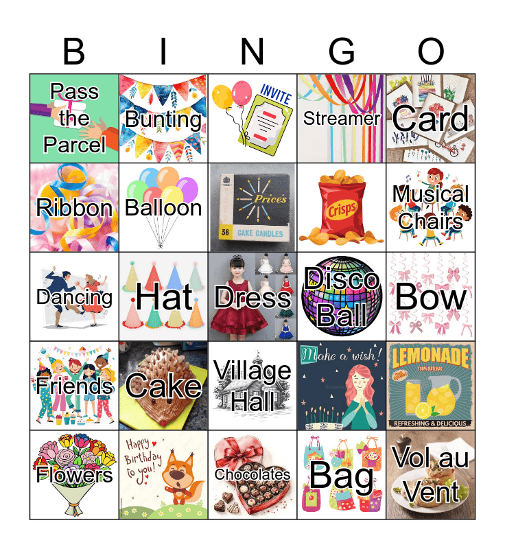 This bingo card has 37 images and 29 words: Sausage Roll, Balloon, Cake, Present, Card, Blowout, Hat, Streamer, Dress, Bow, Ribbon, Friends, Family, Village Hall, Disco Ball, Pass the Parcel, Musical Chairs, Flowers, Chocolates, Badge, Bag, Bunting, Napkins, paper cups, Pin the tail on the Donkey, Face Painting, Dancing, Vol au Vent and Sandwiches.