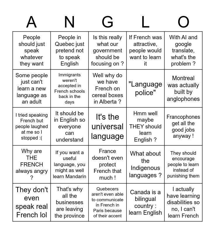 This bingo card has a free space and 24 words: If you want a useful language, you might as well learn Mandarin, That's why all the businesses are leaving the province, Well why do we have French on cereal boxes in Alberta ?, They don't even speak real French lol, With AI and google translate, what's the problem ?, People should just speak whatever they want, Some people just can't learn a new language as an adult, People in Quebec just pretend not to speak English, Hmm well maybe THEY should learn English ?, France doesn't even protect French that much !, "Language police", I tried speaking French but people laughed at me so I stopped :(, What about the Indigenous languages ?, They should encourage people to learn instead of punishing them, Immigrants weren't accepted in French schools back in the days, Canada is a bilingual country : learn English, Francophones get all the good jobs anyway !, Is this really what our government should be focusing on ?, Montreal was actually built by anglophones, It should be in English so everyone can understand, I actually have learning disabilities so no, I can't learn French, Why are THE FRENCH always angry ?, If French was attractive, people would want to learn it and Quebecers aren't even able to communicate in French in Paris because of their accent.