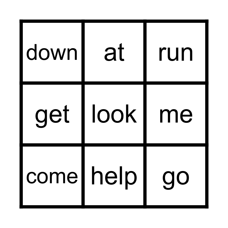 This bingo card has 11 words: go, help, look, come, at, run, me, here, get, down and jump.