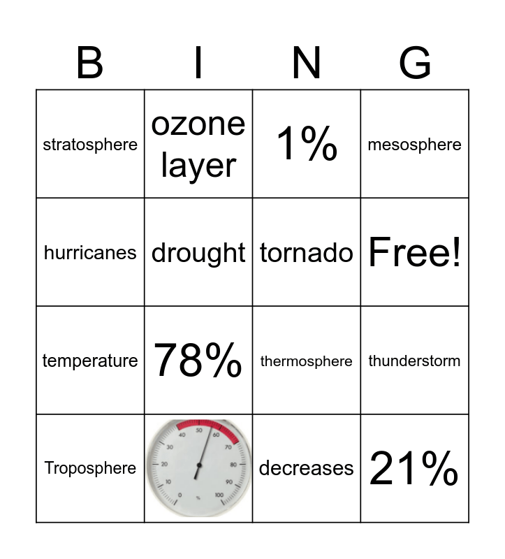 This bingo card has 3 images and 15 words: 78%, 21%, 1%, stratosphere, thermosphere, mesosphere, Troposphere, ozone layer, Free!, temperature, decreases, hurricanes, thunderstorm, drought and tornado.