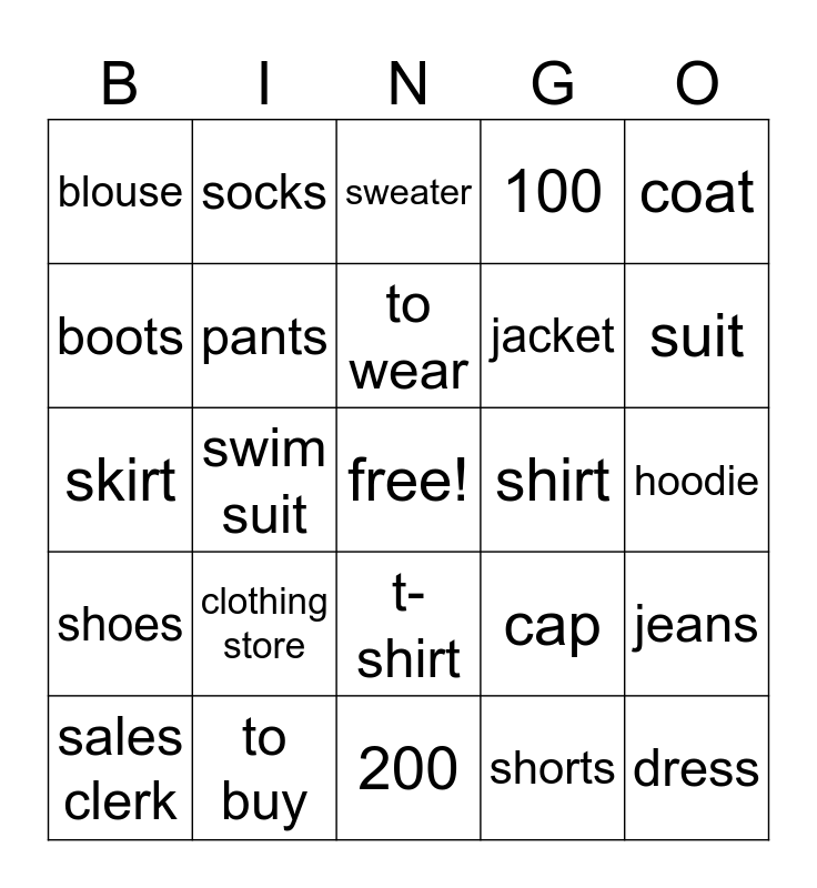 This bingo card has a free space and 24 words: clothing store, to buy, to wear, sales clerk, coat, blouse, boots, socks, shirt, t-shirt, jacket, skirt, cap, jeans, pants, shorts, hoodie, sweater, suit, swim suit, dress, shoes, 100 and 200.