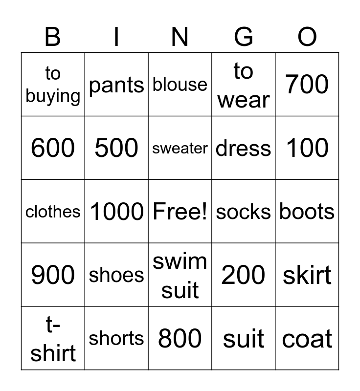 This bingo card has a free space and 24 words: shoes, shorts, sweater, t-shirt, 700, to buying, 600, pants, socks, swim suit, dress, clothes, 200, skirt, 500, suit, boots, blouse, 100, 1000, coat, 900, to wear and 800.