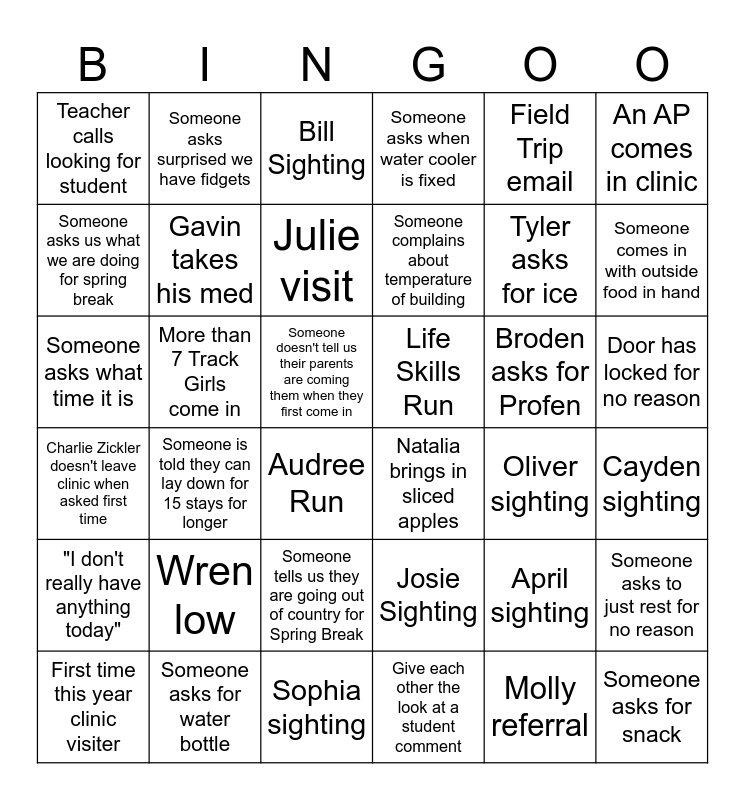 This bingo card has 42 words: Charlie Zickler doesn't leave clinic when asked first time, More than 7 Track Girls come in, Someone complains about sink water, Someone asks when water cooler is fixed, Broden asks for Profen, Cayden sighting, Someone asks us what we are doing for spring break, Craig sighting, Bill Sighting, Someone complains about temperature of building, Tyler asks for ice, Someone comes in with outside food in hand, Teacher calls looking for student, Gavin takes his med, Sophia sighting, Life Skills Run, Molly referral, Door has locked for no reason, "I don't really have anything today", Someone asks surprised we have fidgets, Julie visit, Josie Sighting, Oliver sighting, An AP comes in clinic, First time this year clinic visiter, Someone asks for water bottle, Audree Run, Someone says they threw up in the bathroom, April sighting, Someone asks for snack, Schellhase visit, Wren low, Someone doesn't tell us their parents are coming them when they first come in, Natalia brings in sliced apples, Parent in clinic, Someone asks to just rest for no reason, Someone asks what time it is, Someone is told they can lay down for 15 stays for longer, Someone tells us they are going out of country for Spring Break, Give each other the look at a student comment, Field Trip email and Attendance calls more than 3 times.