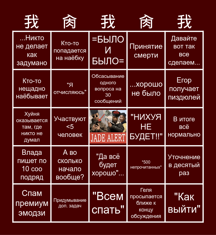 This bingo card has a free space and 24 words: А во сколько начало вообще?, Придумывание доп. задач, Обсасывание одного вопроса на 30 сообщений, Спам премиум эмодзи, Давайте вот так все сделаем..., ...Никто не делает как задумано, Кто-то нещадно наёбывает, Кто-то попадается на наёбку, "НИХУЯ НЕ БУДЕТ!!", "Да всё будет хорошо"..., ...хорошо не было, Хуйня оказывается там, где никто не думал, *500 непрочитанных*, Уточнение в десятый раз, "Я отчисляюсь", Геля просыпается ближе к концу обсуждения, В итоге всё нормально, =БЫЛО И БЫЛО=, Егор получает пиздюлей, Участвуют <5 человек, "Как выйти", Влада пишет по 10 соо подряд, Принятие смерти and "Всем спать".