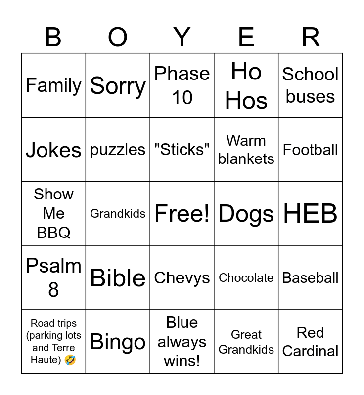 This bingo card has a free space and 52 words: Oh what a beautiful morning!, Red Cardinal, dandelions, Blue always wins!, Bible, Newspaper, Sorry, Uncle Wiggly, Jokes, ping pong, puzzles, Little white car, Baseball, Chocolate, Uno, Mizzou, "Sticks", Dogs, Cats, School buses, Grandkids, Great Grandkids, Family, Warm blankets, Lassie, Birds, Walks, MFA Gardens, Football, Johnny Appleseed song, Ding Dongs, Ho Hos, Awesome tooth puller, tennis, She'll be comin' round the mountain, Phase 10, Bingo, Church, Chickens, Br'er Rabbit, Hats, HEB, Psalm 8, Chuckles, Chevys, Ledgers, Integrity, Show Me BBQ, Oh-ho-ho, Wiffle Ball, Road trips (parking lots and Terre Haute) 🤣 and Singing.