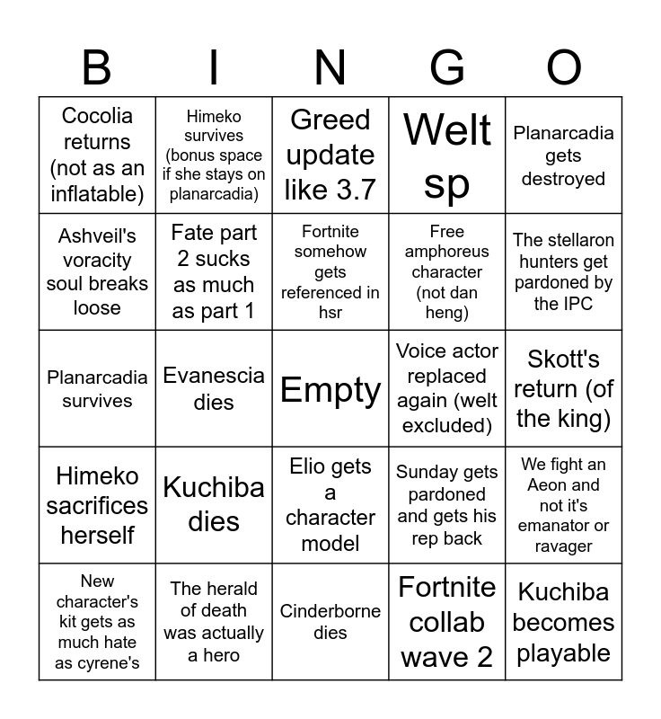 This bingo card has a free space and 24 words: Kuchiba dies, The herald of death was actually a hero, Fortnite somehow gets referenced in hsr, New character's kit gets as much hate as cyrene's, Planarcadia gets destroyed, Cocolia returns (not as an inflatable), Ashveil's voracity soul breaks loose, Himeko survives (bonus space if she stays on planarcadia), Voice actor replaced again (welt excluded), Elio gets a character model, Free amphoreus character (not dan heng), Planarcadia survives, Sunday gets pardoned and gets his rep back, We fight an Aeon and not it's emanator or ravager, Fate part 2 sucks as much as part 1, Fortnite collab wave 2, Skott's return (of the king), Greed update like 3.7, The stellaron hunters get pardoned by the IPC, Evanescia dies, Kuchiba becomes playable, Himeko sacrifices herself, Welt sp and Cinderborne dies.