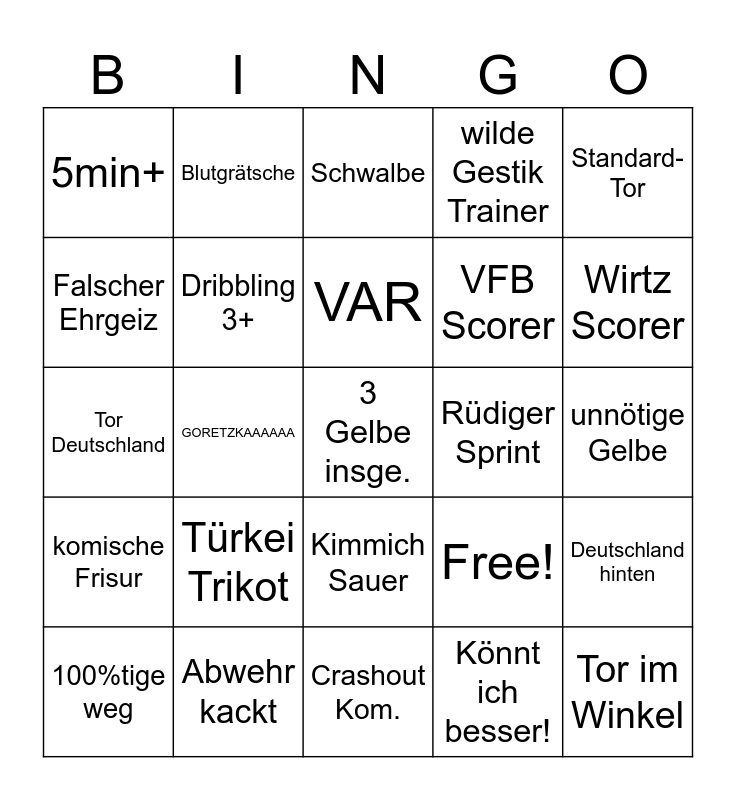 This bingo card has 25 words: Türkei Trikot, Crashout Kom., VAR, 100%tige weg, Standard-Tor, 5min+, Falscher Ehrgeiz, Blutgrätsche, Rüdiger Sprint, Kimmich Sauer, VFB Scorer, Tor Deutschland, Free!, Deutschland hinten, Dribbling 3+, Tor im Winkel, unnötige Gelbe, Schwalbe, Wirtz Scorer, GORETZKAAAAAA, 3 Gelbe insge., Abwehr kackt, komische Frisur, wilde Gestik Trainer and Könnt ich besser!.