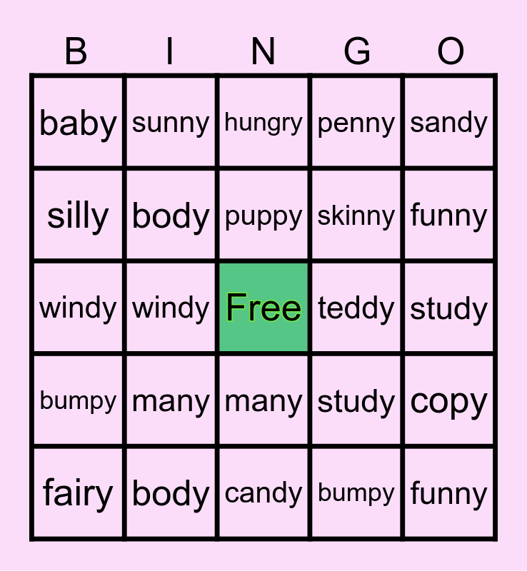 This bingo card has a free space and 48 words: bunny, funny, fairy, candy, many, bumpy, sunny, mommy, silly, twenty, body, penny, copy, study, happy, salty, puppy, teddy, hungry, sandy, windy, bumpy, baby, skinny, bunny, funny, fairy, candy, many, bumpy, sunny, mommy, silly, twenty, body, penny, copy, study, happy, salty, puppy, teddy, hungry, sandy, windy, bumpy, baby and skinny.