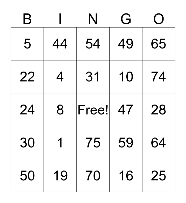 This bingo card has a free space and 24 words: 1, 19, 31, 50, 65, 5, 22, 44, 47, 75, 10, 24, 59, 64, 4, 16, 28, 54, 74, 8, 25, 30, 49 and 70.