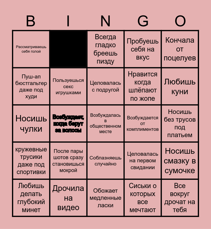 This bingo card has 25 words: кружевные трусики даже под спортивки, Дрочила на видео, Возбуждалась в общественном месте, Сиськи о которых все мечтают, Кончала от поцелуев, Рассматриваешь себя голой, Круглая упругая попа, Всегда гладко бреешь пизду, Возбуждается от комплиментов, Носишь смазку в сумочке, Пуш-ап бюстгальтер даже под худи, Пользуешься секс игрушками, Обожает медленные ласки, Целовалась на первом свидании, Любишь куни, Любишь делать глубокий минет, Возбуждает, когда берут за волосы, Целовалась с подругой, Нравится когда шлёпают по жопе, Носишь без трусов под платьем, Носишь чулки, После пары шотов сразу становишься мокрой, Соблазняешь случайно, Пробуешь себя на вкус and Все вокруг дрочат на тебя.