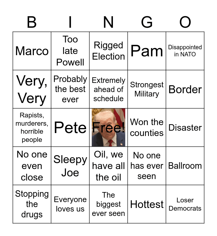 This bingo card has a free space and 24 words: Sleepy Joe, Everyone loves us, Extremely ahead of schedule, Stopping the drugs, Disappointed in NATO, Marco, Very, Very, Too late Powell, Won the counties, Oil, we have all the oil, Strongest Military, Rapists, murderers, horrible people, No one has ever seen, Ballroom, Probably the best ever, Hottest, Disaster, Rigged Election, Border, Pete, Loser Democrats, No one even close, Pam and The biggest ever seen.