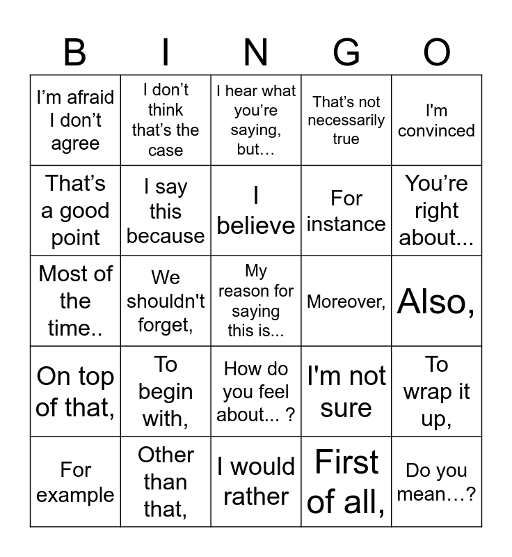 This bingo card has 25 words: To begin with,, I would rather, I believe, For example, I'm convinced, I’m afraid I don’t agree, That’s a good point, I don’t think that’s the case, Moreover,, How do you feel about... ?, For instance, Most of the time.., I'm not sure, To wrap it up,, I say this because, Do you mean…?, Also,, I hear what you’re saying, but…, You’re right about..., We shouldn't forget,, My reason for saying this is..., Other than that,, On top of that,, That’s not necessarily true and First of all,.