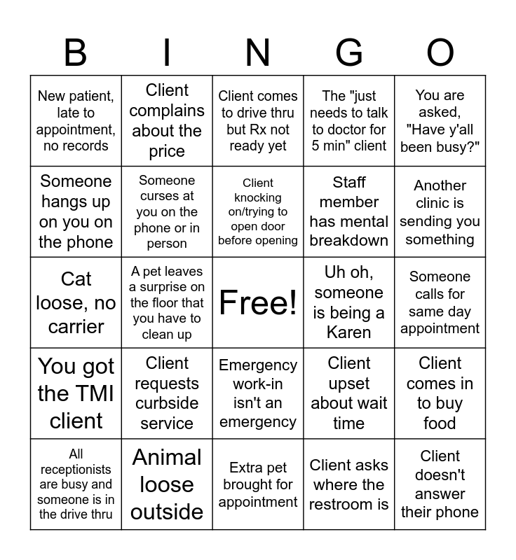 This bingo card has a free space and 24 words: Client requests curbside service, Animal loose outside, Client knocking on/trying to open door before opening, All receptionists are busy and someone is in the drive thru, You are asked, "Have y'all been busy?", New patient, late to appointment, no records, Someone hangs up on you on the phone, Client complains about the price, Uh oh, someone is being a Karen, Emergency work-in isn't an emergency, Staff member has mental breakdown, Cat loose, no carrier, Client upset about wait time, Client comes in to buy food, Someone curses at you on the phone or in person, Client asks where the restroom is, Someone calls for same day appointment, Client comes to drive thru but Rx not ready yet, Another clinic is sending you something, A pet leaves a surprise on the floor that you have to clean up, Client doesn't answer their phone, You got the TMI client, The "just needs to talk to doctor for 5 min" client and Extra pet brought for appointment.