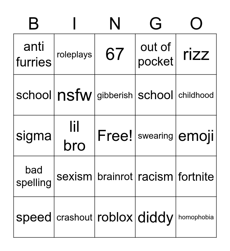 This bingo card has a free space and 24 words: sexism, crashout, gibberish, speed, rizz, anti furries, school, roleplays, swearing, brainrot, school, sigma, racism, fortnite, nsfw, diddy, emoji, 67, childhood, lil bro, homophobia, bad spelling, out of pocket and roblox.