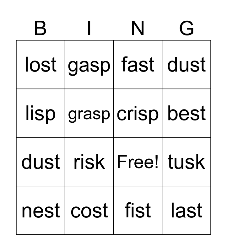 This bingo card has 19 words: Free!, mask, fast, last, tusk, lisp, fist, lost, gasp, dust, risk, grasp, crisp, cost, nest, wasp, dust, best and ask.