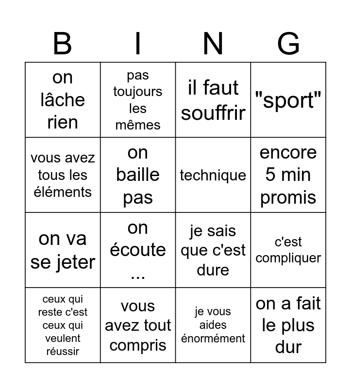 This bingo card has 16 words: vous avez tout compris, c'est compliquer, il faut souffrir, on lâche rien, on va se jeter, pas toujours les mêmes, je sais que c'est dure, je vous aides énormément, vous avez tous les éléments, on baille pas, ceux qui reste c'est ceux qui veulent réussir, "sport", on écoute ..., encore 5 min promis, technique and on a fait le plus dur.