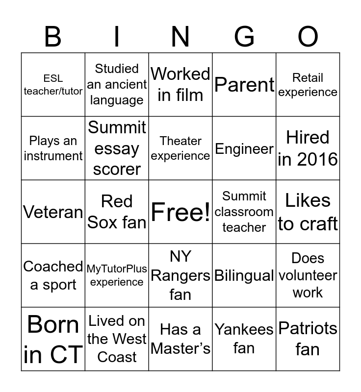 This bingo card has a free space and 27 words: Bilingual, Attorney, Engineer, Has a Master’s, Plays an instrument, Worked in film, Studied an ancient language, Coached a sport, Summit classroom teacher, Does volunteer work, Veteran, Parent, Born in CT, Lived on the West Coast, Hired in 2016, 4+ years experience with Summit, Summit essay scorer, Theater experience, MyTutorPlus experience, ESL teacher/tutor, Likes to craft, Yankees fan, Red Sox fan, Patriots fan, NY Rangers fan, Retail experience and Author.